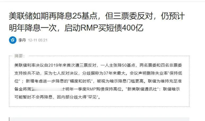 美联储在北京时间12月11日的凌晨时分,又一次宣布降息了,而且一降就是25个基点,其实单看这则消息本身的话,真的不算是什么意外的事情。