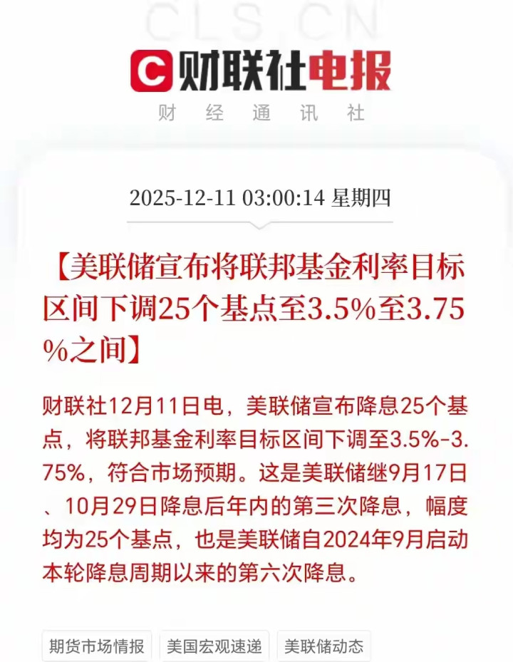 先来说说美联储这一次的具体操作吧。他们公开宣布,要把联邦基金利率的目标区间,直接下调到3.50%到3.75%这个范围。这已经是美联储自从去年9月正式开启降息周期以来,所进行的第六次降息了,同时也是今年9月之后,连续第三次实施降息举措。
