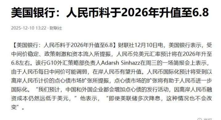 于是乎,市场上关于人民币汇率“破7”,甚至会走向更强势位置的预测,就开始变得越来越多了。美国银行就预测,人民币兑美元的汇率到2026年的时候,很可能会升值到6.8左右的水平。